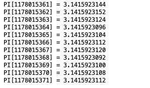 Random random = new Random(); BigDecimal totalTimes = BigDecimal.ZERO; BigDecimal innerTimes = BigDecimal.ZERO; BigDecimal num4 = new BigDecimal("4"); while (true) { double ranX = random.nextDouble() * 2 - 1; double ranY = random.nextDouble() * 2 - 1; double result = ranX * ranX + ranY * ranY; if (result < 1) { innerTimes = innerTimes.add(BigDecimal.ONE); } totalTimes = totalTimes.add(BigDecimal.ONE); BigDecimal PI = innerTimes.divide(totalTimes, 10, BigDecimal.ROUND_CEILING).multiply(num4); System.out.println("PI[" + totalTimes.toString() + "] = " + PI.toString()); }